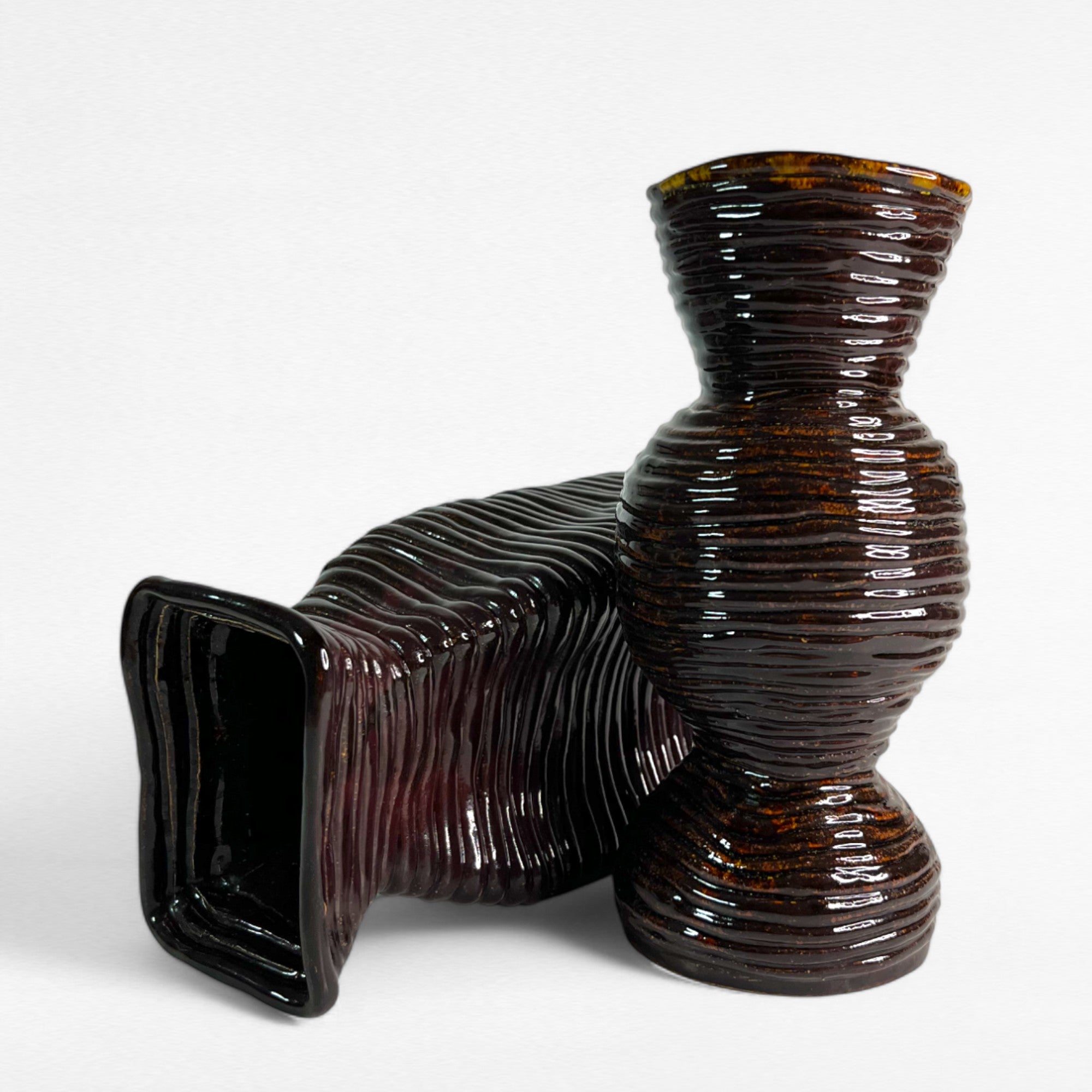These vases are raised with coils, allowing them to capture a thousand light reflections.